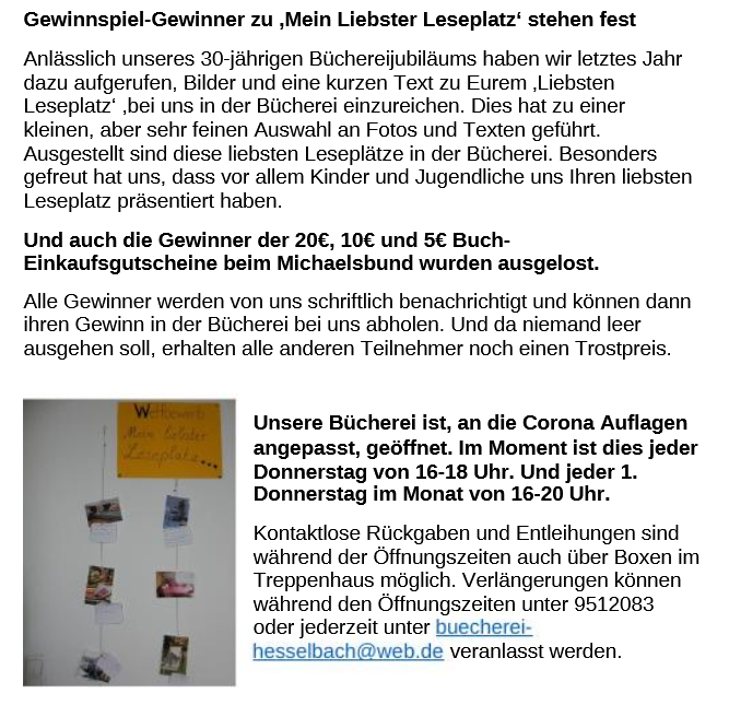 Sie können direkt beim Online-Shop des Sankt Michaelsbundes bestellen. Einfach unter www.michaelsbund.de stöbern, Ihre Wunschbücher in den Warenkorb legen und nicht vergessen, ganz zum Schluss beim Bestellschritt „Bestätigen“ unsere Bücherei als Vermittlungspartner auswählen. Das geht am besten durch die Eingabe der Postleitzahl, darauf achten, dass Hesselbach im Auswahlfeld steht. Die Bestellung kommt dann direkt zu Ihnen. Wir freuen uns aber auch über jeden, der den Weg in unsere Bücherei findet, wir kaufen regelmäßig neue Bücher, so halten wir auch dieses Jahr wieder einiges an Sommerlektüre für Sie bereit.